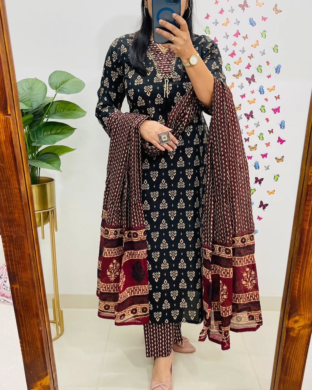 Elevate your ethnic style with this elegant Black & Maroon Printed Kurti Dupatta Set, featuring classic block-inspired motifs and rich contrast detailing. Crafted from soft, breathable fabric, this outfit offers timeless appeal with everyday comfort. The beautifully coordinated dupatta adds depth and grace, making it perfect for office wear, casual outings, and festive daywear.