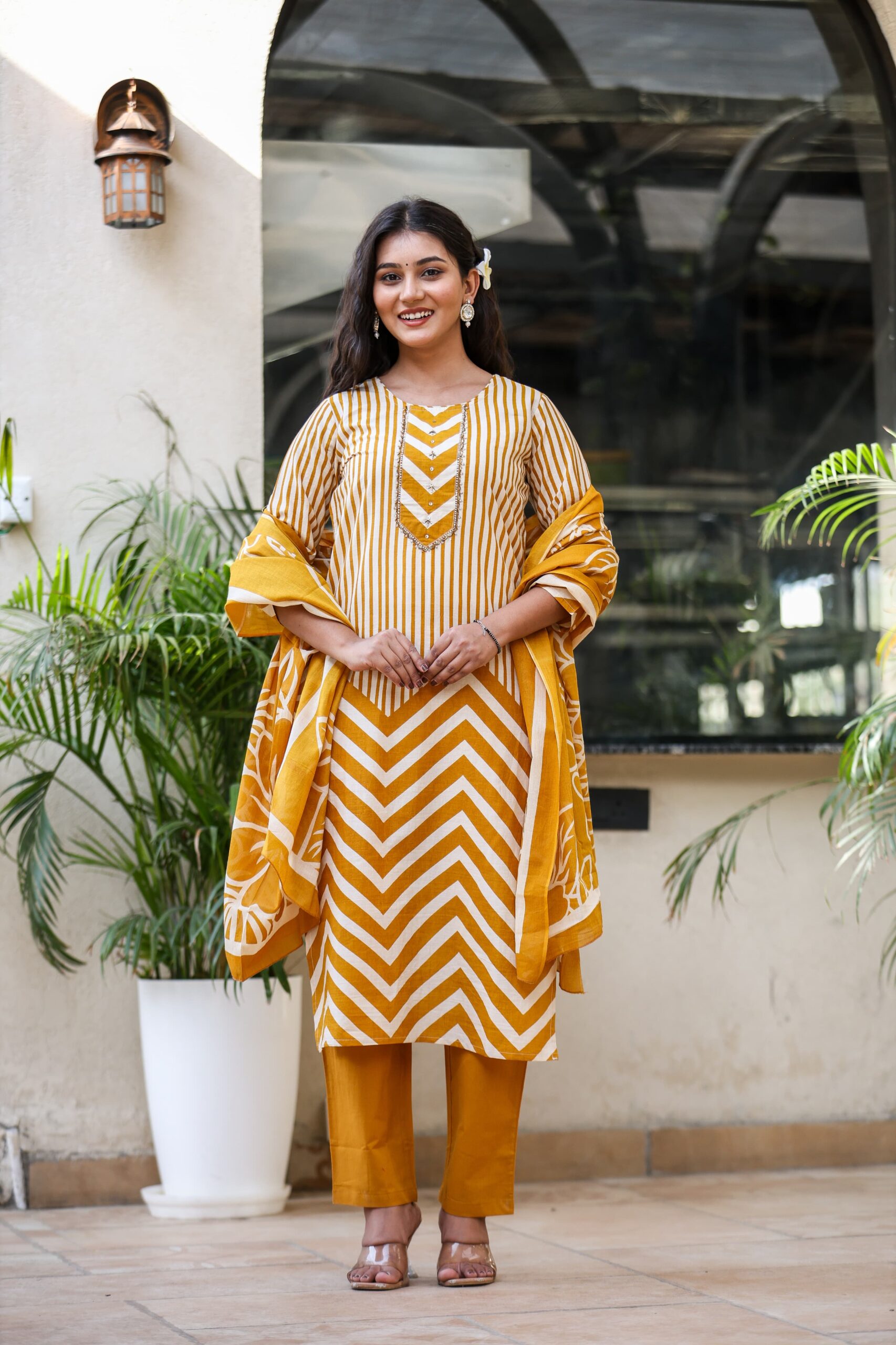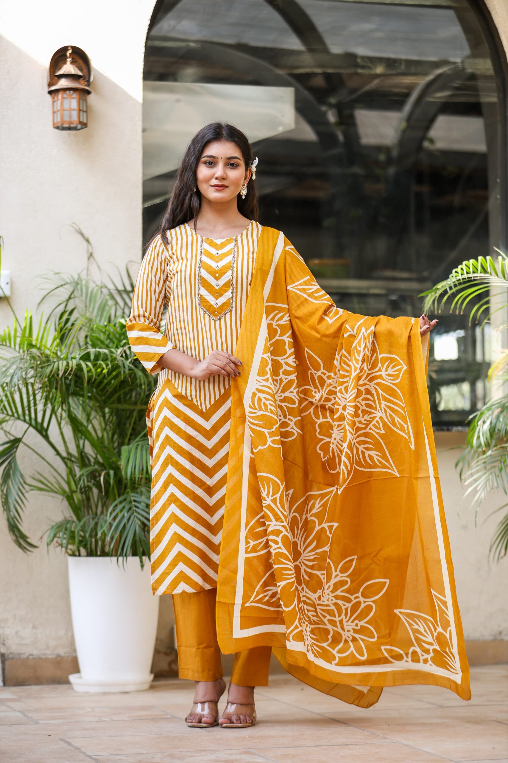 Brighten your ethnic wardrobe with this elegant Mustard Yellow Kurti Pant Dupatta Set, designed with a beautiful mix of stripes, chevron patterns, and floral prints. Crafted from soft, breathable fabric, this outfit offers a perfect balance of comfort and style. Ideal for daily wear, festive daywear, and casual outings, this set brings a fresh and graceful look.
