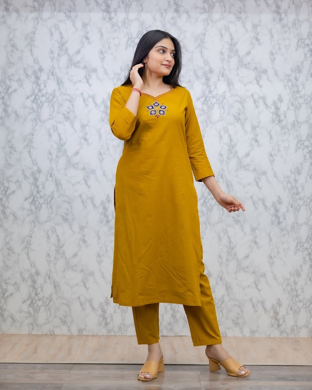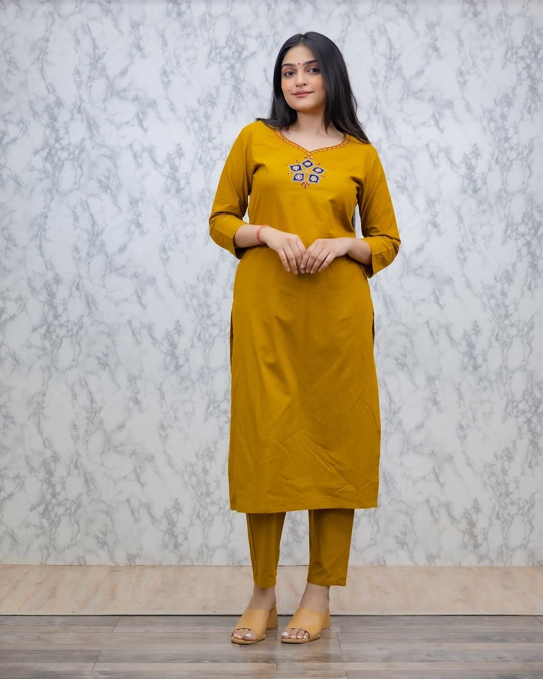 Keep your ethnic style minimal and elegant with this Mustard Yellow Solid Kurti Pant Set. Designed in a clean, straight silhouette, this outfit features subtle neckline embroidery that adds just the right touch of charm. Made from soft, breathable fabric, it is perfect for daily wear, office wear, and comfortable casual outings.