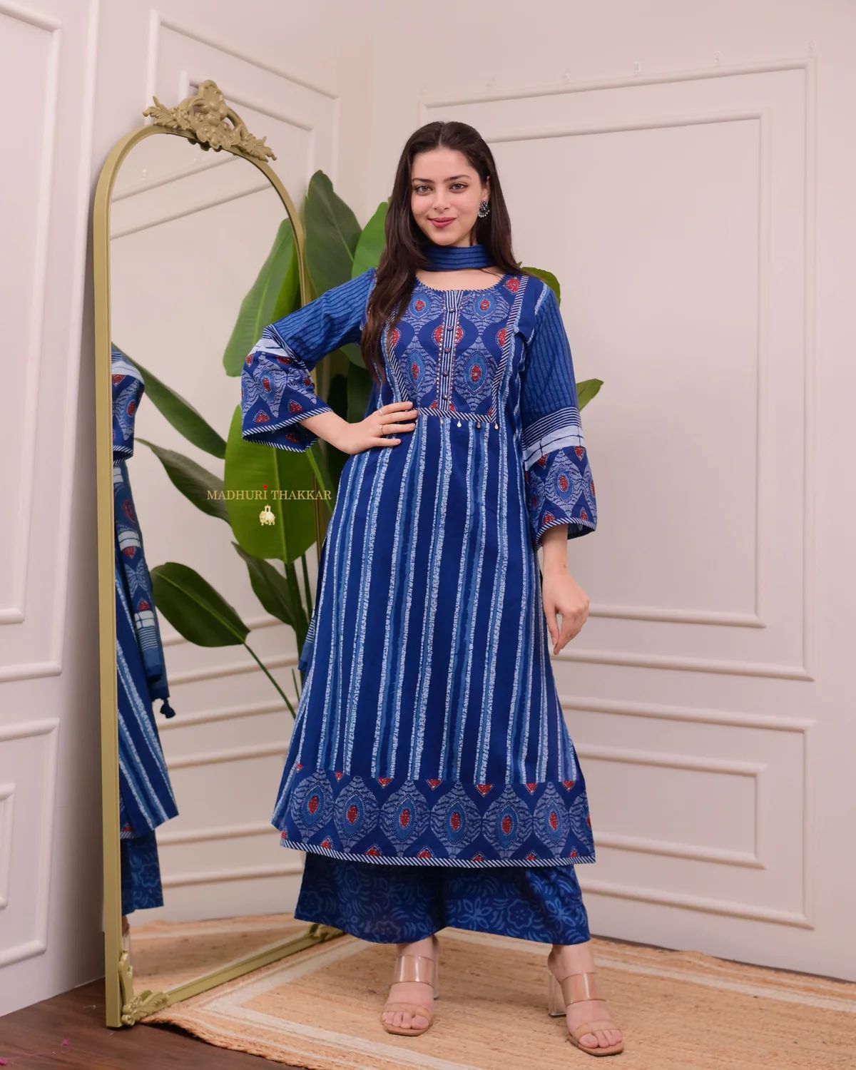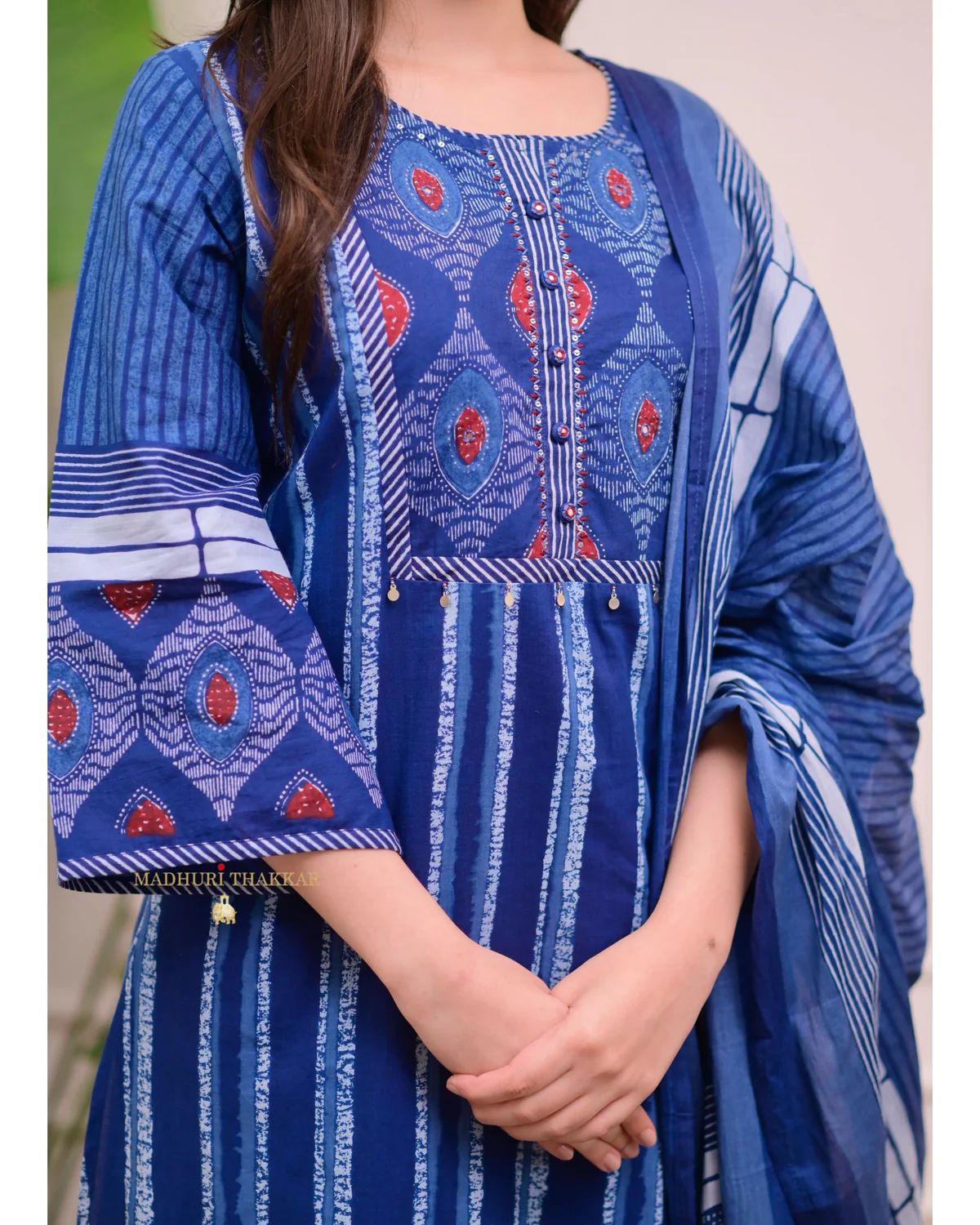 ay ethnic style with this elegant Indigo Blue Kurti & Dupatta Set, crafted in soft cotton fabric. Featuring traditional block-inspired prints with contrast detailing, this outfit offers a perfect blend of comfort, grace, and timeless Indian aesthetics. Ideal for daily wear, office wear, festive gatherings, and casual outings.